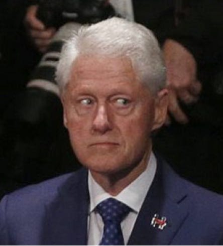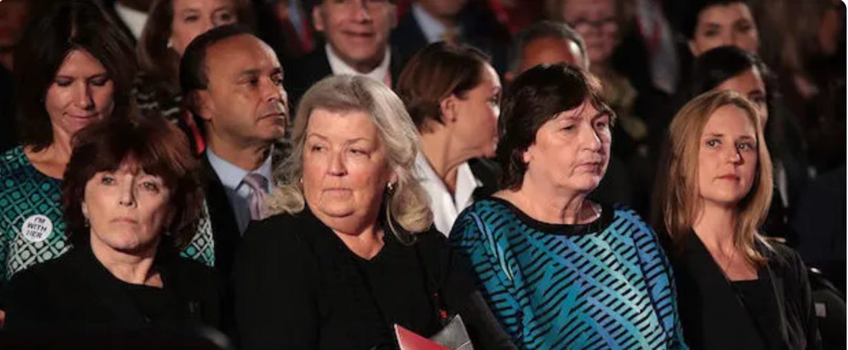 Bill Clinton at the October 2016 debate between Donald Trump and Hillary Clinton, when he saw in the audience Juanita Broaddrick, Paula Jones, Kathleen Willey, and Kathy Shelton, who had accused him of sexual assault or rape.