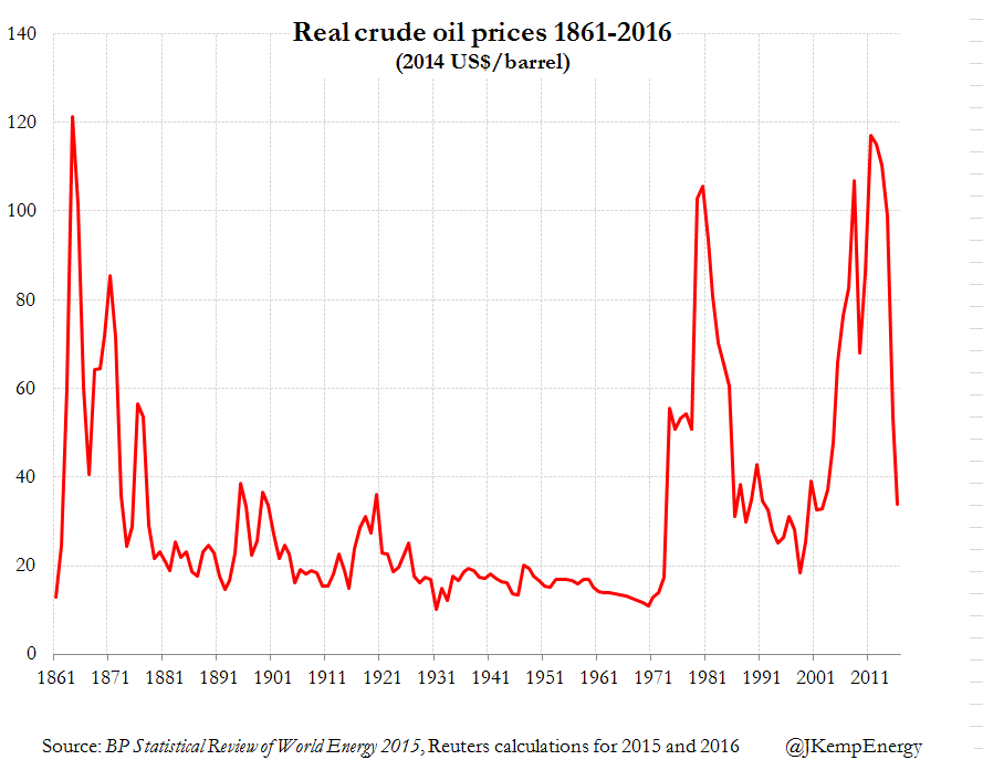 A desperate situation can sometimes be best summed up by numbers. Here’s one that neatly captures the effect the oil price crash has had on the London market. The combined market value of 112 publicly traded oil companies — the entirety of Britain’s listed industry excluding the top three of Shell, BP and BG — is the same as that of Marks & Spencer: £7bn. The primary culprit for this collective capsize is the oil price. In the North Sea this has led to a disastrous contraction, threatening an industry that employs more than 375,000 people and was, until recently, one of the richest sources of tax revenue for the exchequer. Last year the Office for Budget Responsibility predicted that 2016 tax revenue would fall to £600m, a 95% drop from the £12.9bn generated for the exchequer in 2009. Even that low figure may prove optimistic. --Danny Fortson, The Sunday Times, 10 January 2016