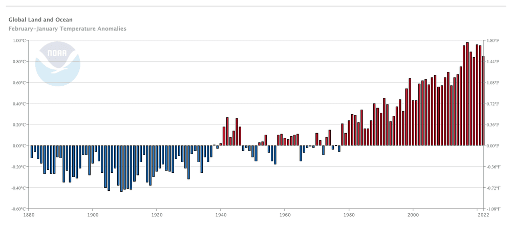 Before getting to the specifics of the work of O’Neill et al., we should look first briefly at the end product that NCEI puts out, and how they attempt to use that product. As one example of the hockey stick form of the data as presented by NCEI, here is one of several NCEI presentations of global temperature data from 1880 through the most recent month of January 2022: