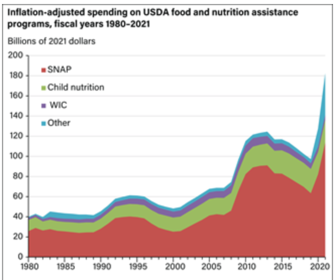 So in just Biden’s first year in office, federal food and nutrition spending soared by some $60 billion, which is about the entire level of such spending at the time Obama first took office less than 14 years ago.