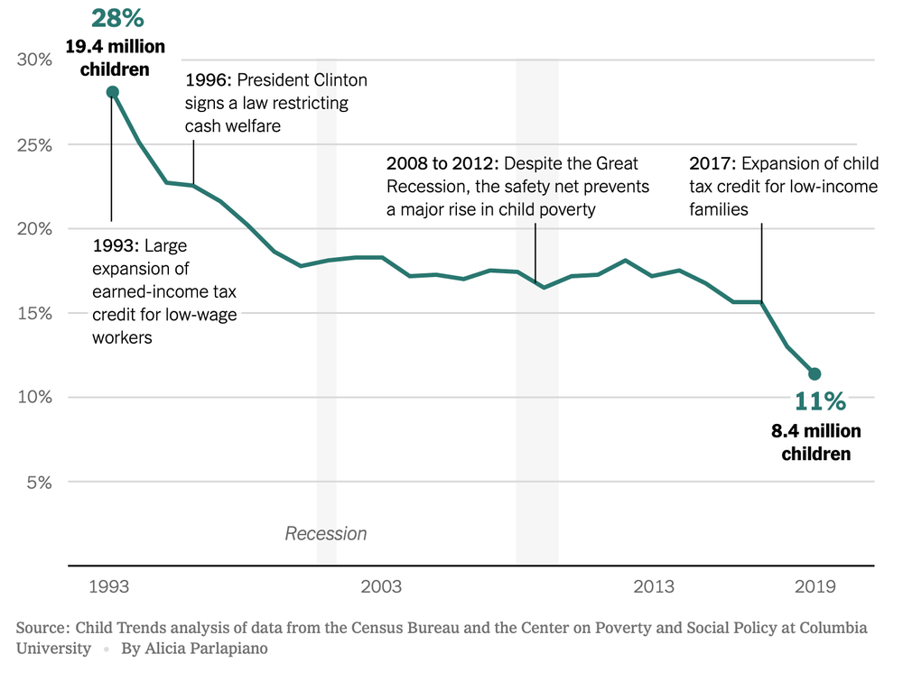 Since 1993? In other words, this Times piece completely contradicts the official left-wing narrative covering the Trump years, including the pieces linked above from the AAP, CDF, and even in the Times itself. Here is the Times’s chart of the decline in child poverty since 1993: