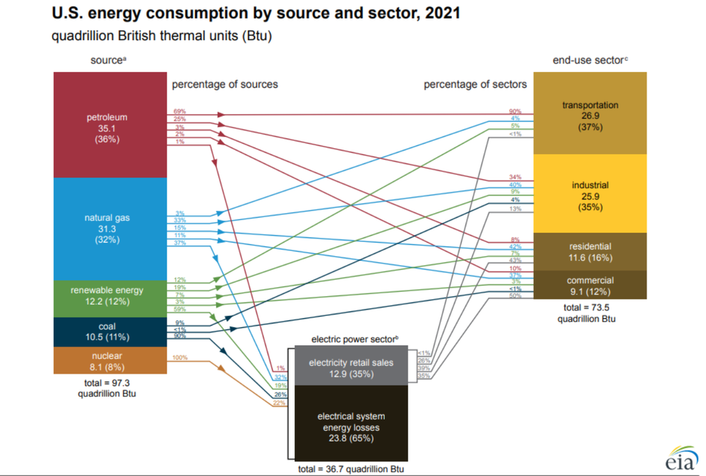 OK, then, how much electricity is this going to take? I’ll start with this handy (if somewhat complicated) chart from the U.S. Energy Information Administration showing production (by source) and use (by sector) of all energy in the U.S. for the year 2021 (I do not find a chart for 2022 available as of yet.):