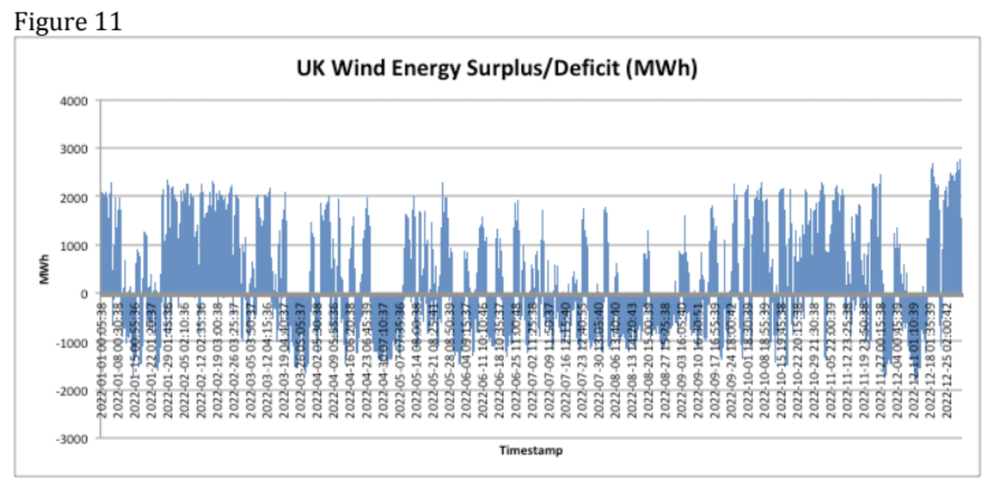 Ponton next assumes purchase of 12,000 GWh of battery storage capacity. With that in place, here is his chart of additions and withdrawals from storage based on the UK 2022 data: