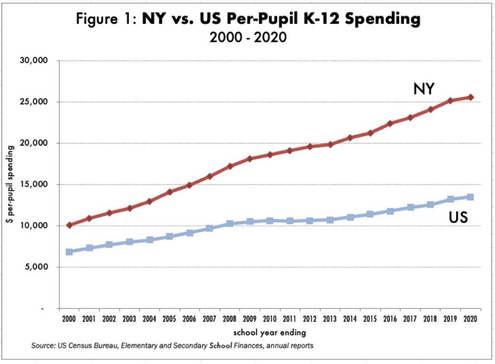 In 2000 New York State spent an average of about $10,000 per pupil, versus a national average of about $7000, representing about a 42% premium. By 2020, New York State spent about $26,000 per pupil, versus a national average of about $13,500, for a premium of about 93%.